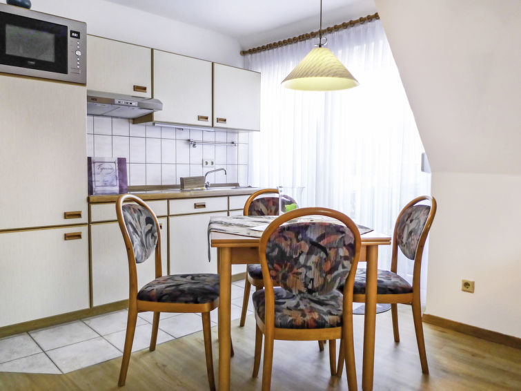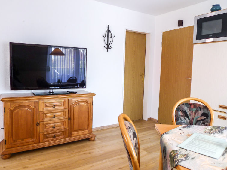 2-Zimmer-Wohnung 40 m2, im Obergeschoss. Gemütlich eingerichtet: Wohn-/Esszimmer 17 m2 mit 1 Diwanbett (140 cm, Länge 200 cm), Sat-TV (Flachbildschirm), Radio. 1 Zimmer 9 m2 mit 1 Doppelbett (2 x 90 cm, Länge 200 cm). Kochnische (4 Glaskeramikplatten, Toaster, Wasserkocher, Mikrowelle, elektrische Kaffeemaschine, Kombinationsmikrowelle). Dusche/WC. Balkon. Balkonmöbel. Zur Verfügung: Kinderhochstuhl (extra). Bitte beachten: Nichtraucher-Unterkunft.