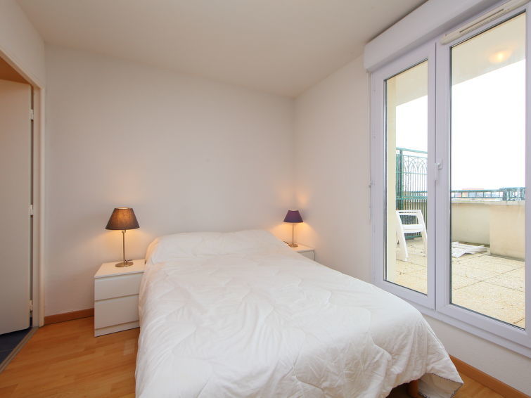 Appartement 4-kamers 66 m2 op 2 verdiepingen op de 5e verdieping, op het noordwesten gelegen. Woon-/eetkamer met TV, Flatscreen TV, stereo-installatie en DVD. Uitgang naar het terras. 1 kamer met 1 2-pers bed (140 cm, lengte 190 cm), douche. Uitgang naar het terras. Kookhoek (afwasmachine, 2 keramische glas kookplaten, broodrooster, waterkoker, elektrische koffiemachine). Aparte WC. Elektrische verwarming, boiler. Bovenverdieping: 1 kamer met afgeschuinde daken met 1 2-pers divanbed (160 cm, lengte 200 cm), TV (Flatscreen TV). 1 kamer met afgeschuinde daken met 1 x 2 stapelbedden (90 cm, lengte 190 cm). Bad/WC. Elektrische verwarming. Parketvloeren. Terras 20 m2, op het noordwesten gelegen. Terrasmeubelen. Panoramazicht op zee, het landschap en de rivier. Ter beschikking: wasmachine. Internet (Internet (WiFi), gratis). Parkeerplaats nr. 1843 (overdekt). Rookmelders.